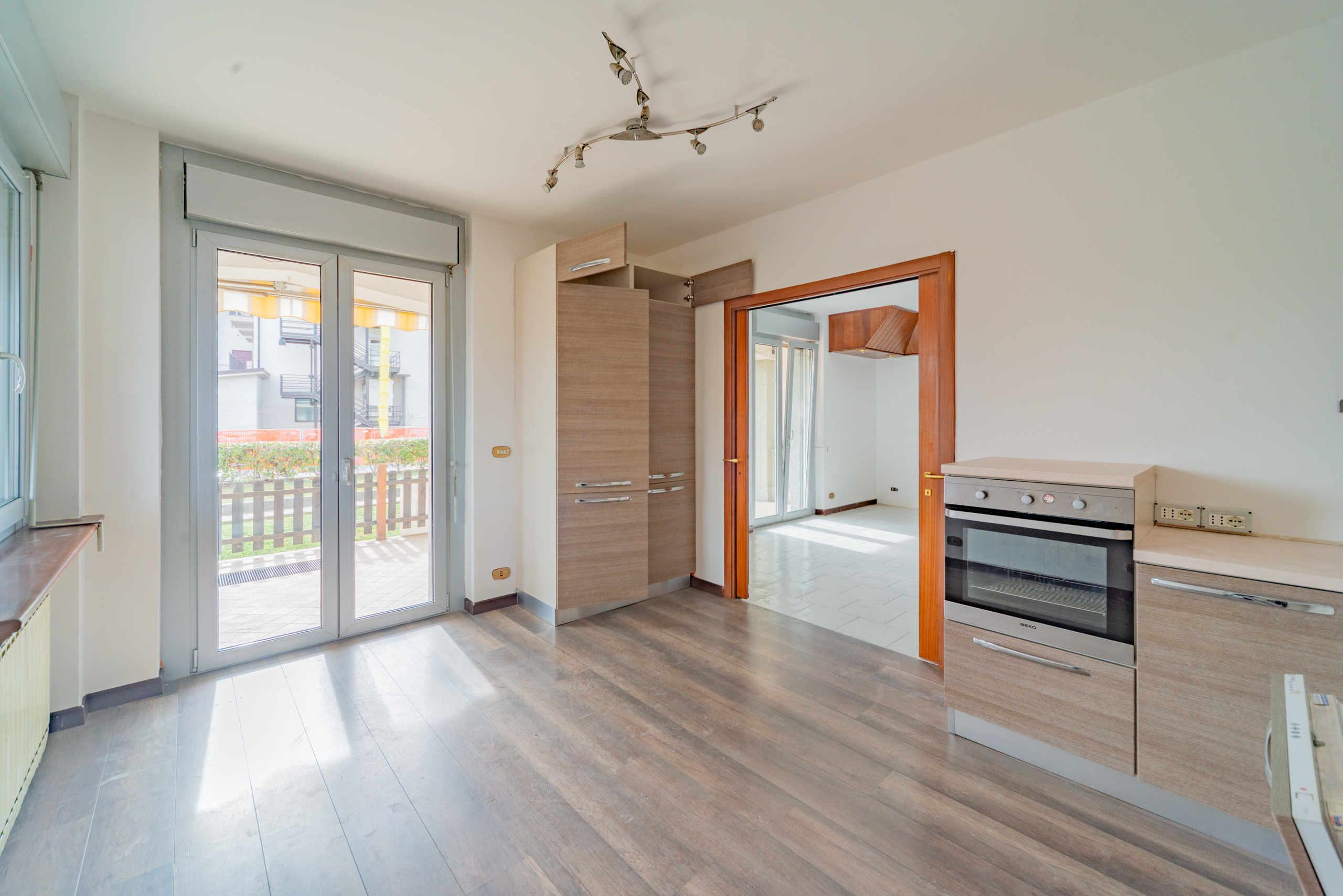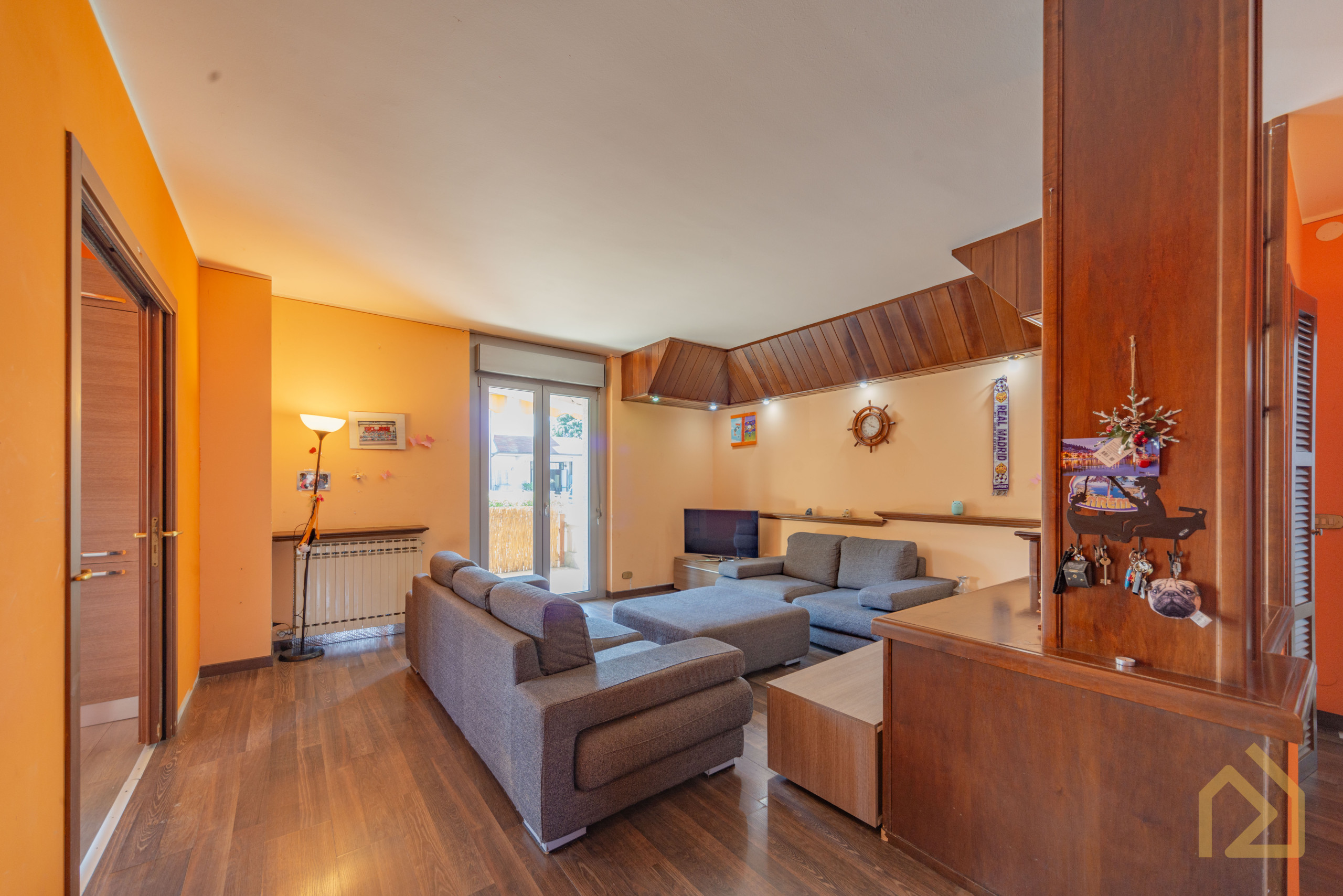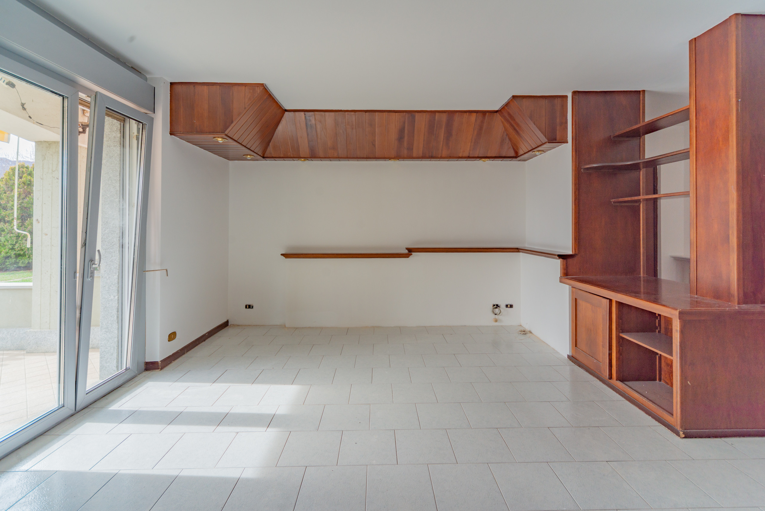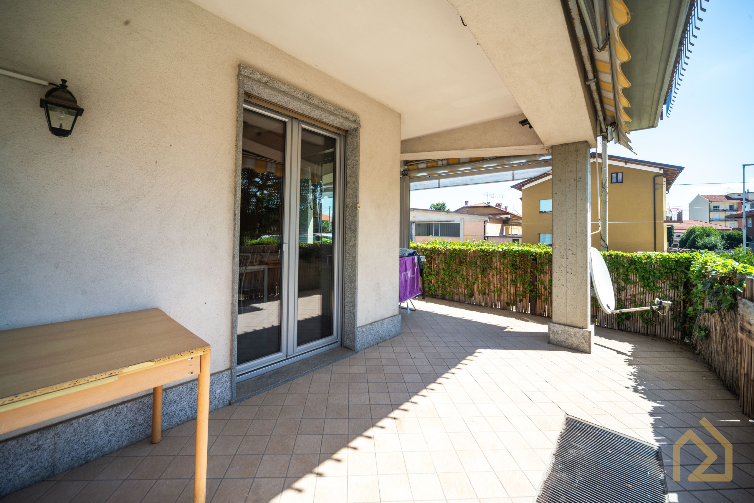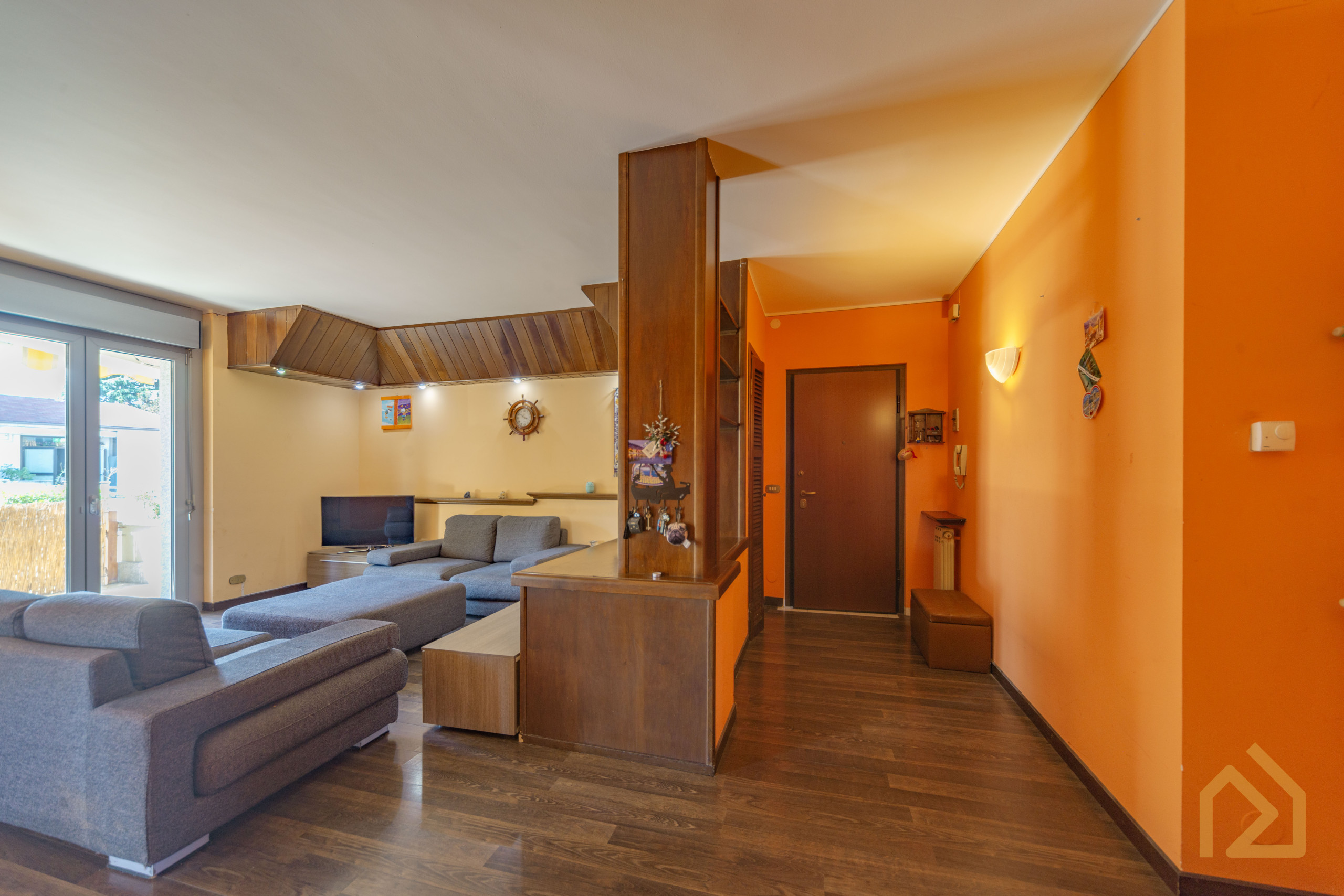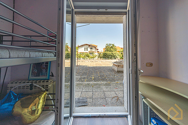 Appena entri ti accoglie un grande soggiorno caldo, luminoso, con spazi veri, quelli che ti permettono di mettere l’albero di Natale accanto al tavolo da pranzo senza dover spostare nulla. Immagina un pranzo in famiglia, la tavolata lunga, i nipoti che corrono dentro e fuori sul terrazzo, quel terrazzo coperto che d’estate si trasforma in una seconda casa: lucine appese, una griglia accesa, e tu che finalmente ti godi tutto senza fare una rampa di scale.