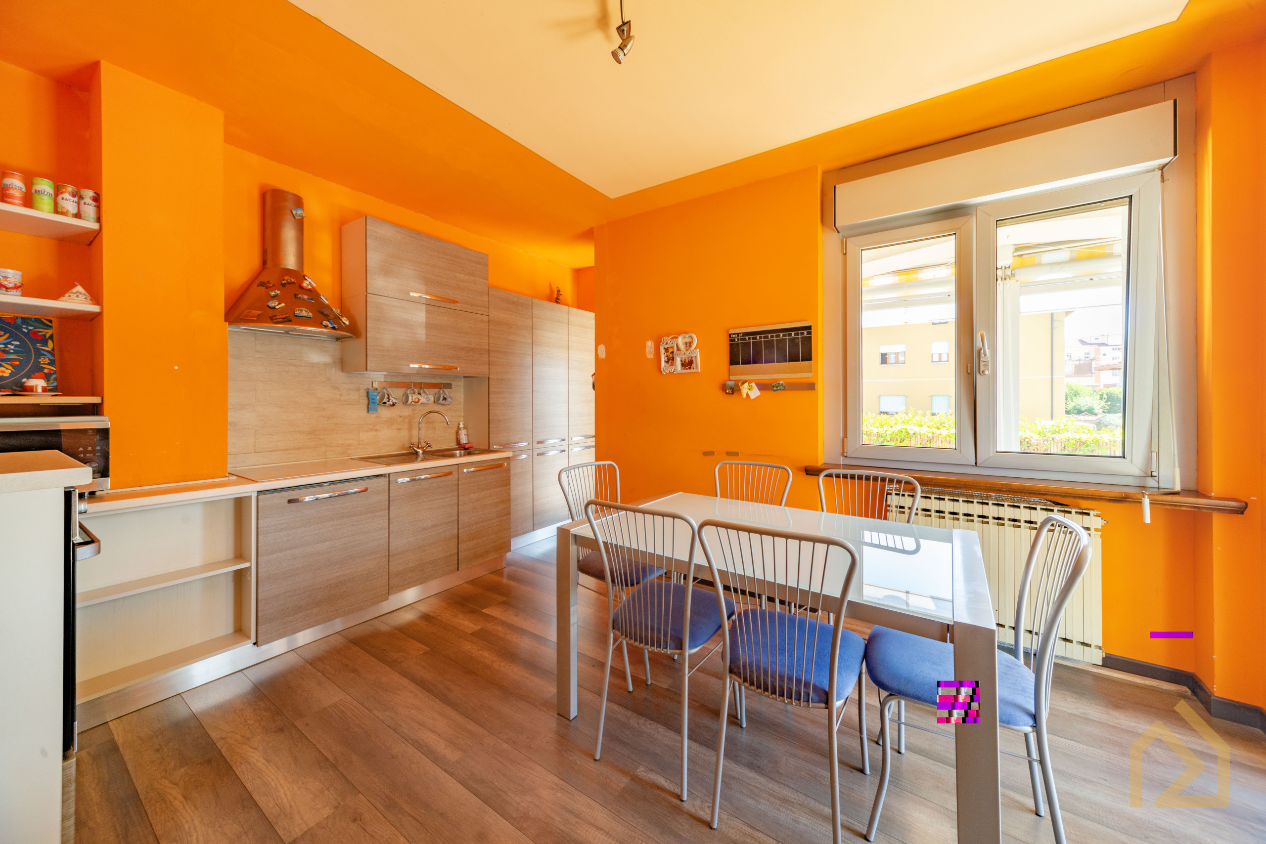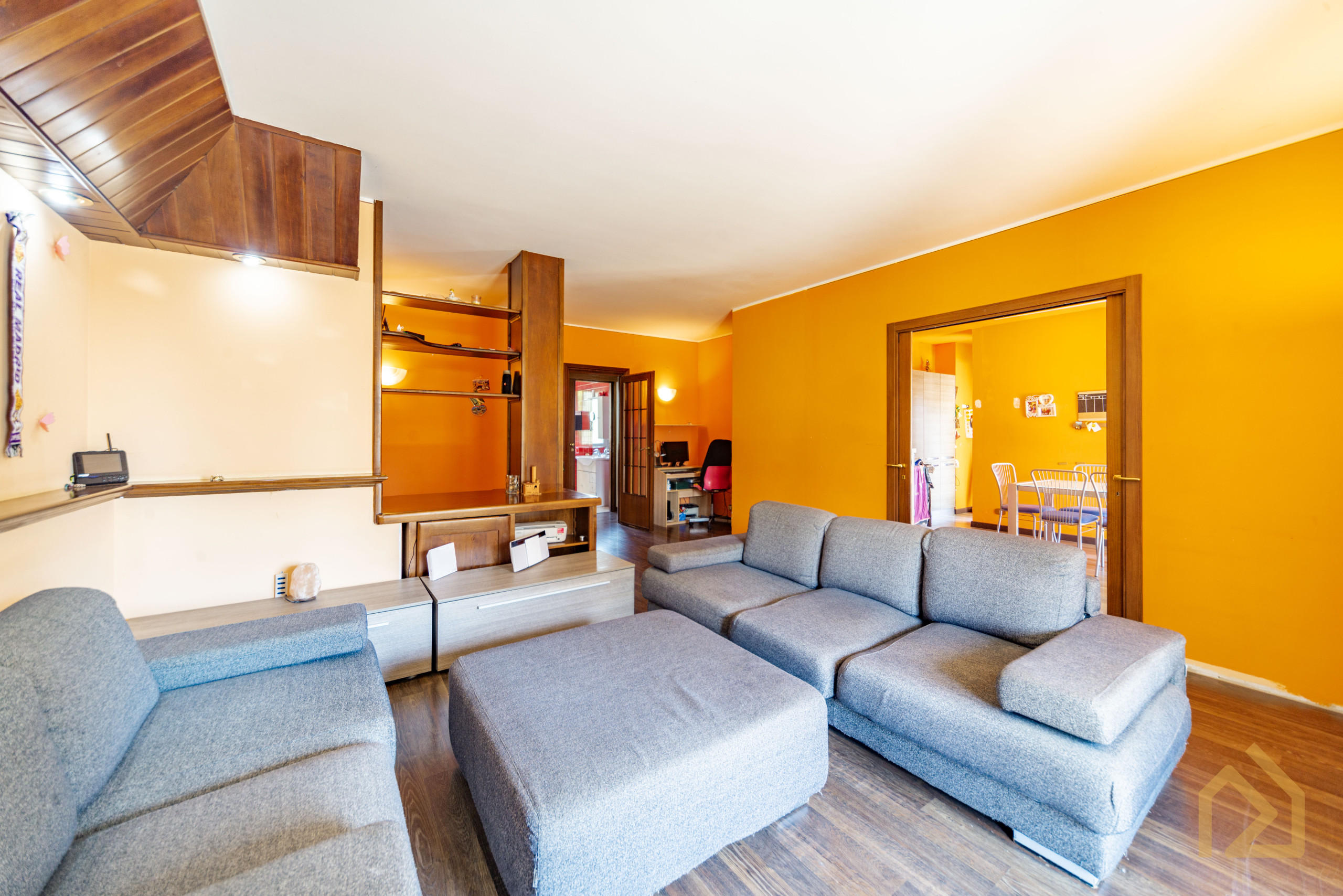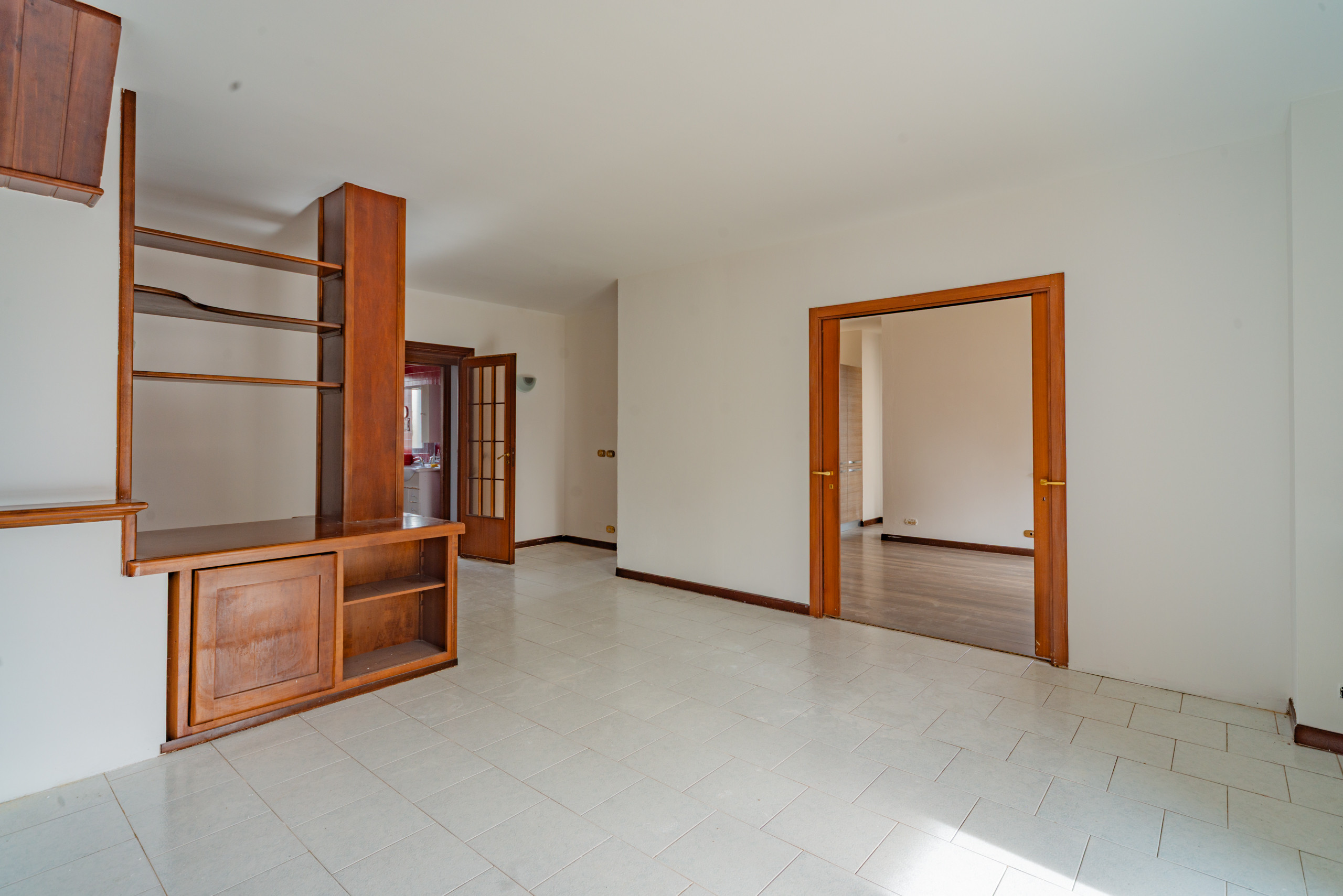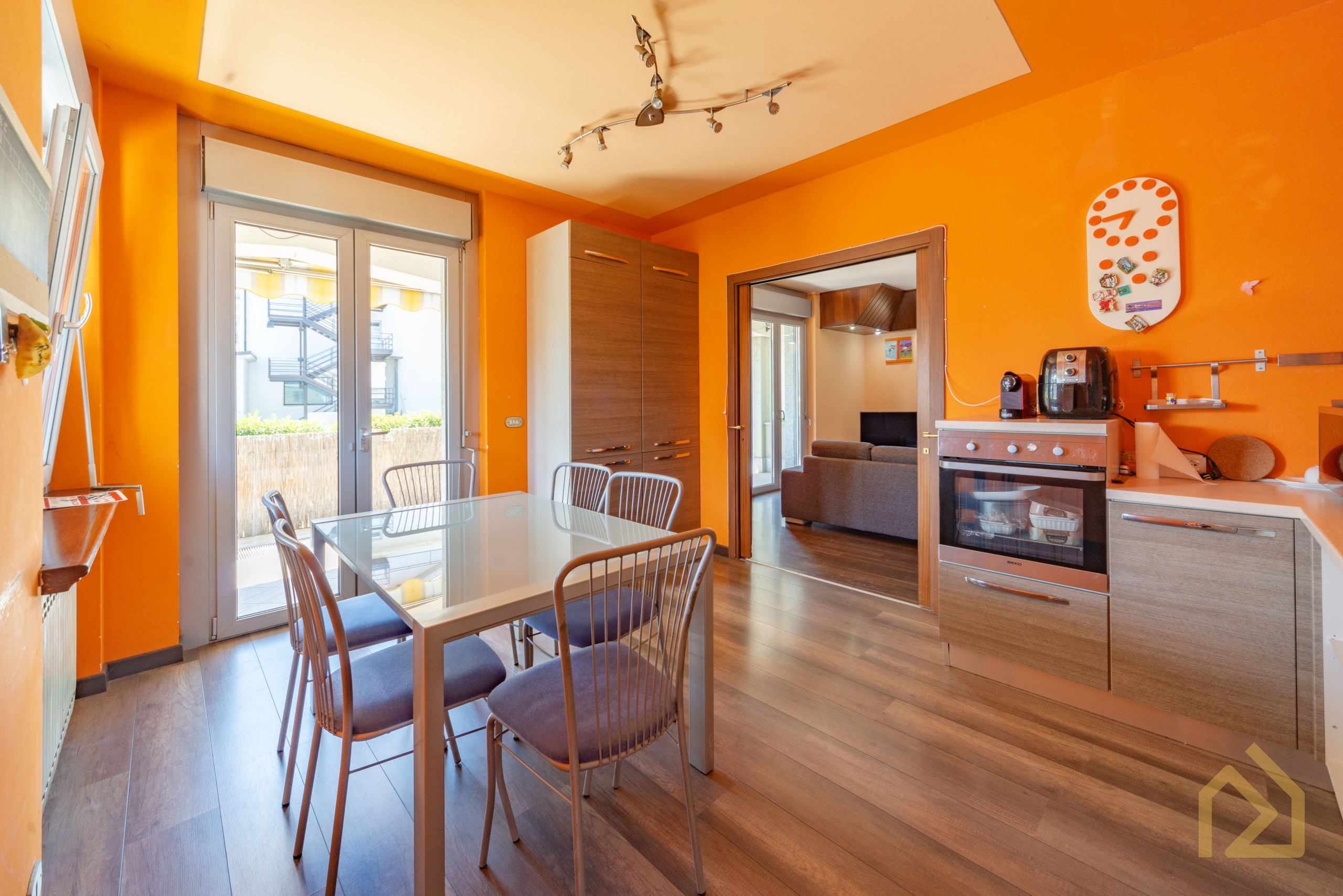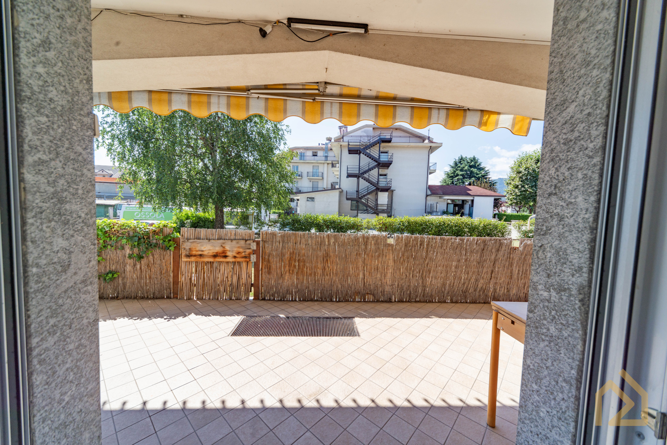 Appena entri ti accoglie un grande soggiorno caldo, luminoso, con spazi veri, quelli che ti permettono di mettere l’albero di Natale accanto al tavolo da pranzo senza dover spostare nulla. Immagina un pranzo in famiglia, la tavolata lunga, i nipoti che corrono dentro e fuori sul terrazzo, quel terrazzo coperto che d’estate si trasforma in una seconda casa: lucine appese, una griglia accesa, e tu che finalmente ti godi tutto senza fare una rampa di scale.