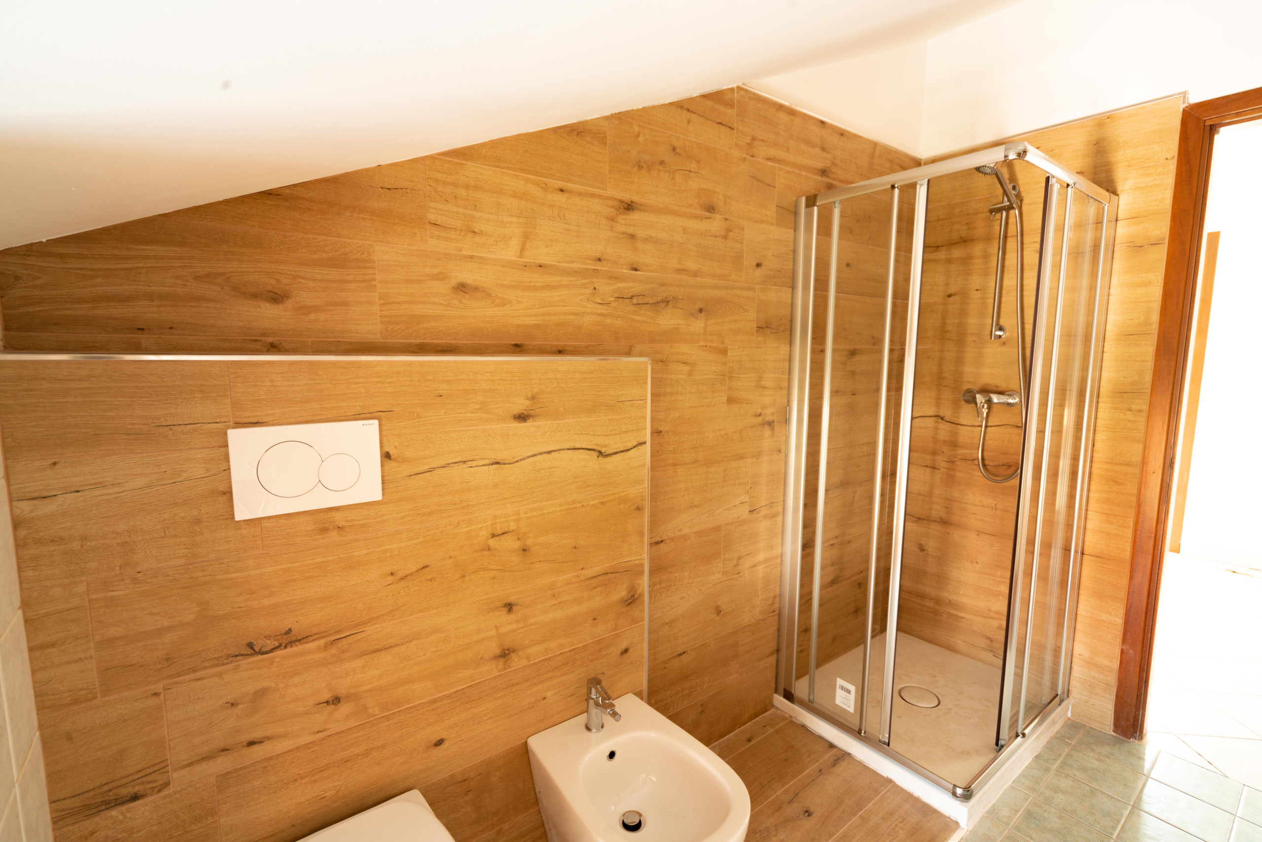 Anche il bagno in ceramica color legno profuma di benessere quotidiano.