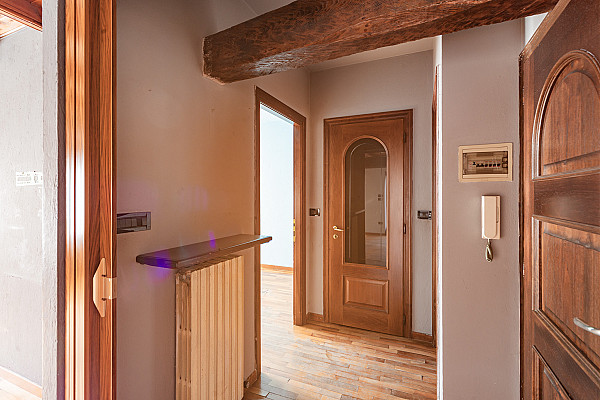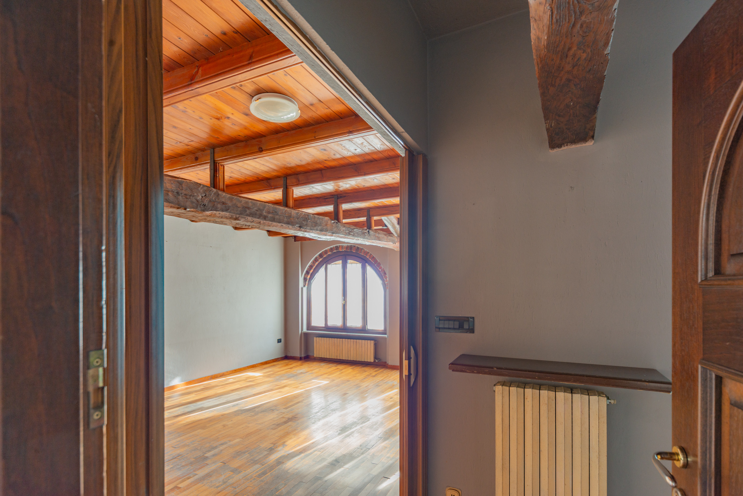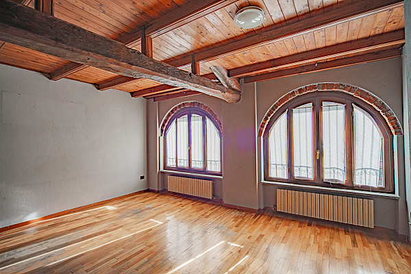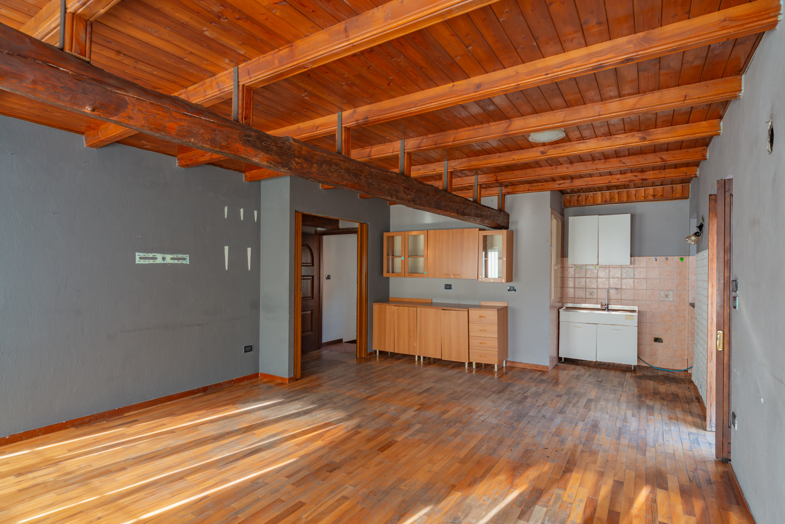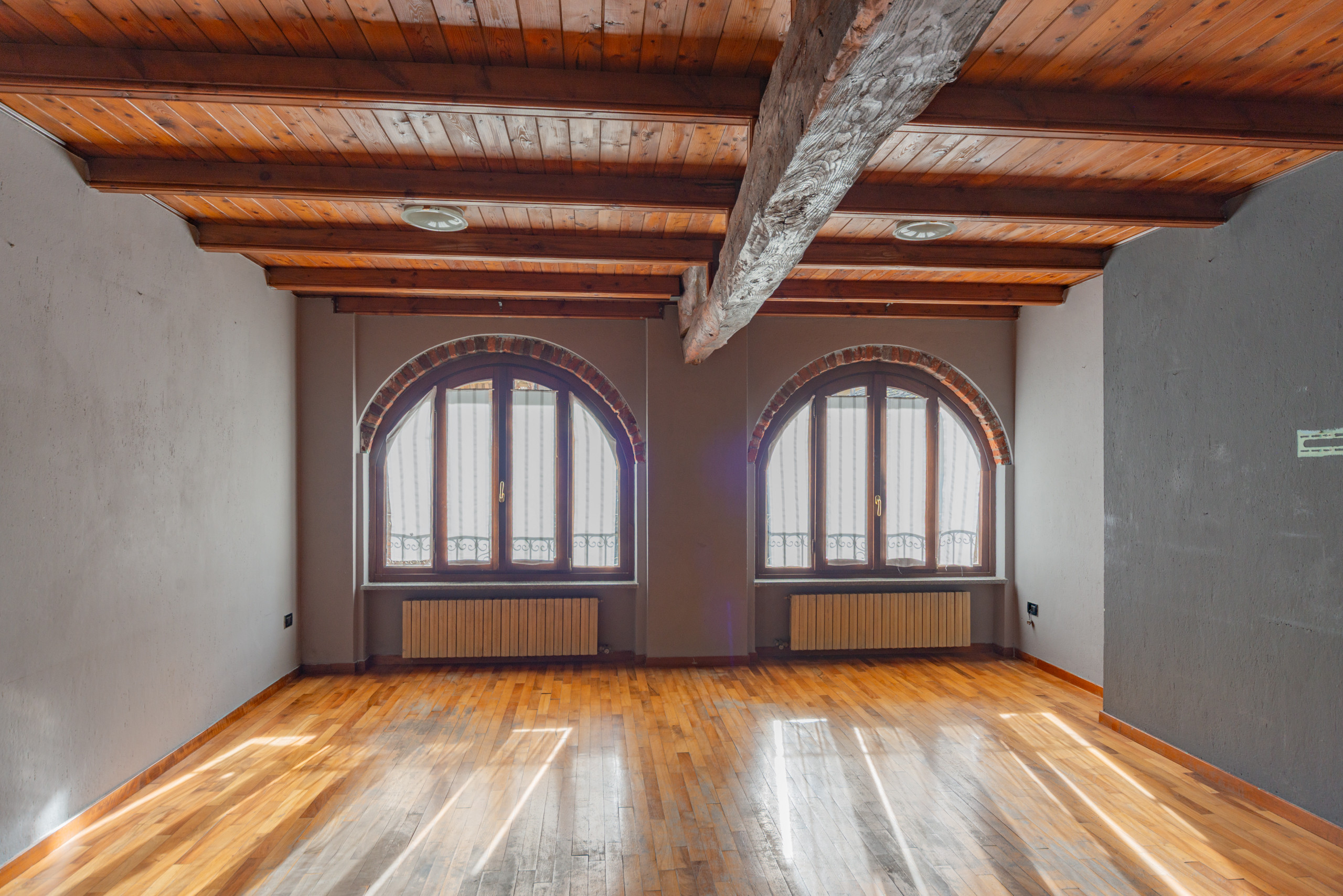 Dentro trovi il carattere che cercavi: travi a vista, parquet, e luce vera che entra da grandi infissi e accende ogni angolo.