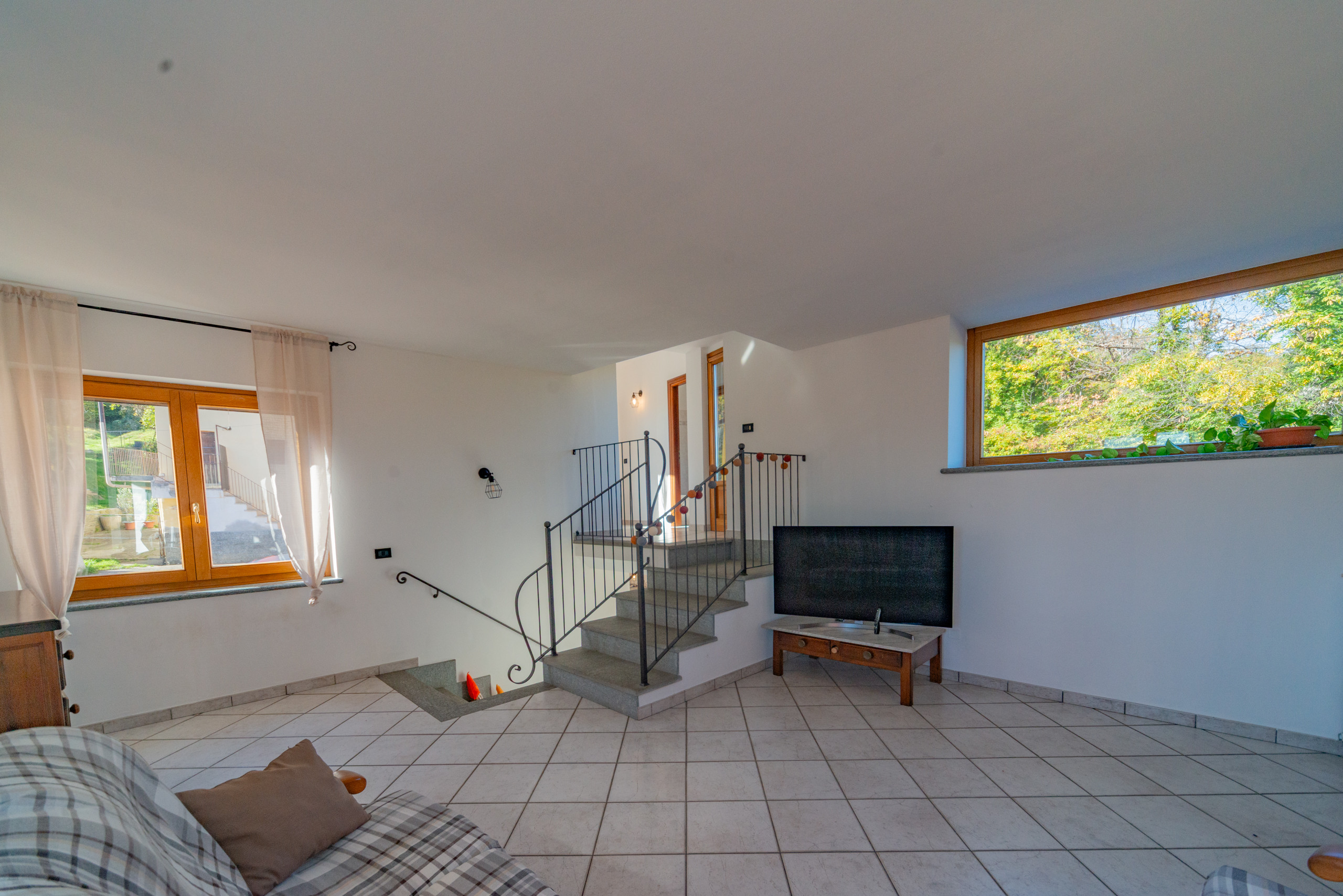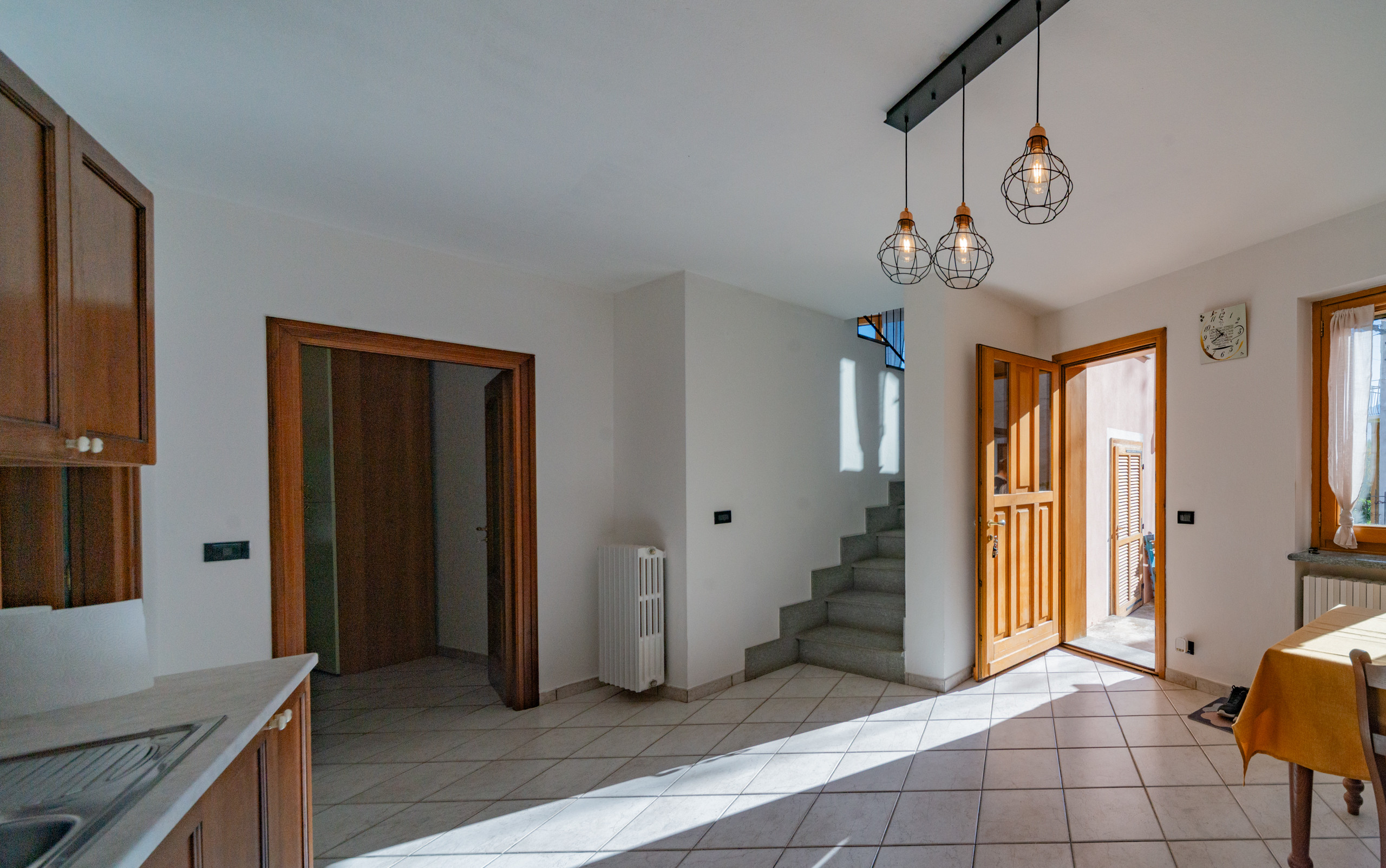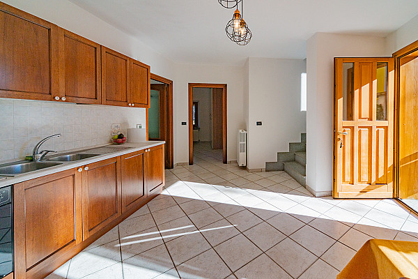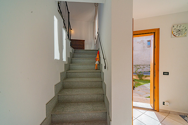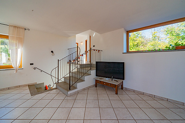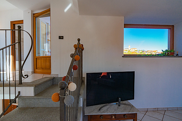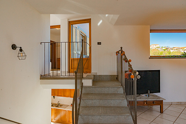 La zona giorno accoglie con il calore di un abbraccio — un soggiorno dove immaginare la prima cena con gli amici, la cucina dove ridere mentre si prepara qualcosa insieme, e la scala che accompagna alle camere, intime e luminose, dove ogni mattina inizia con calma e serenità.