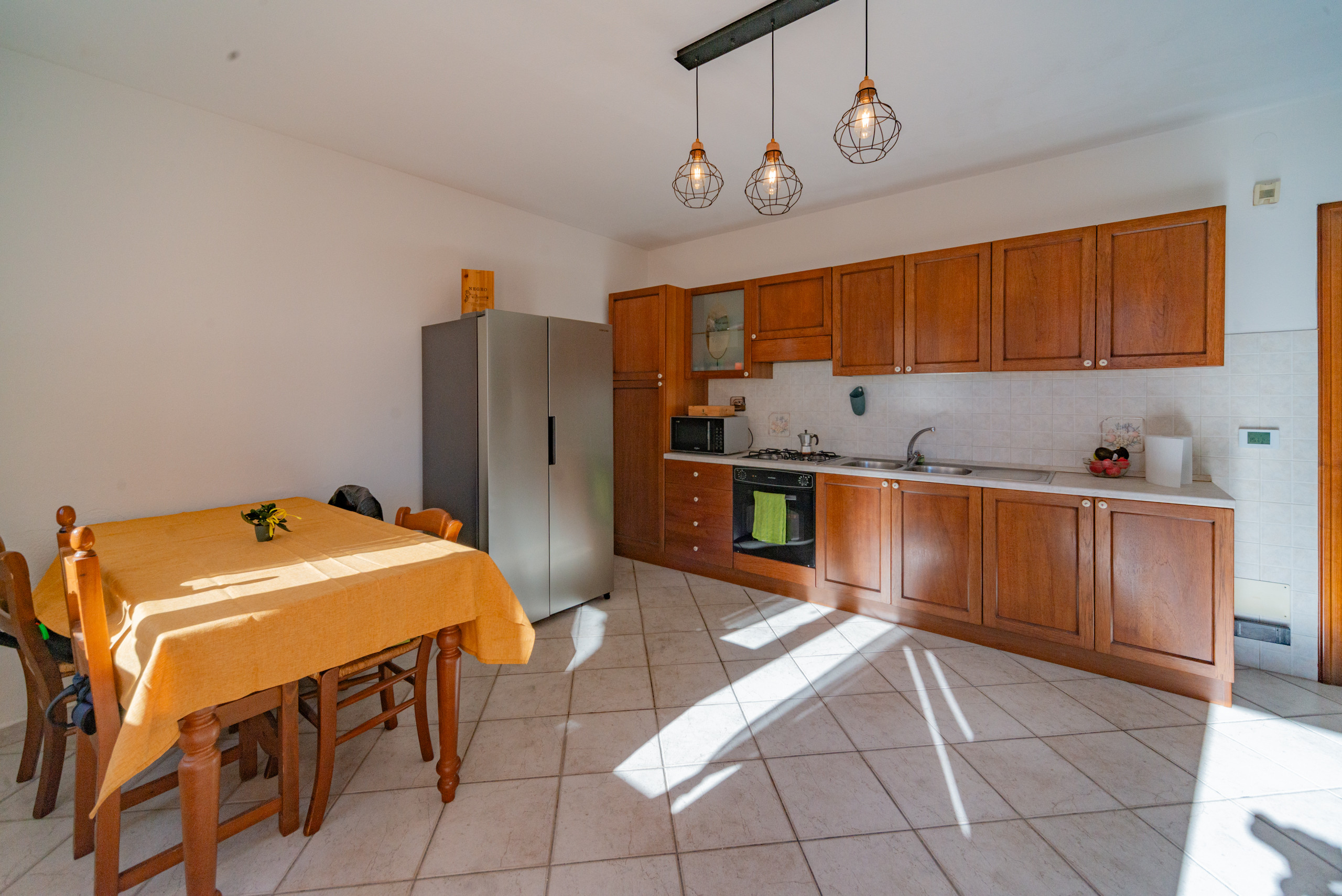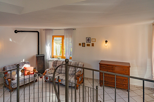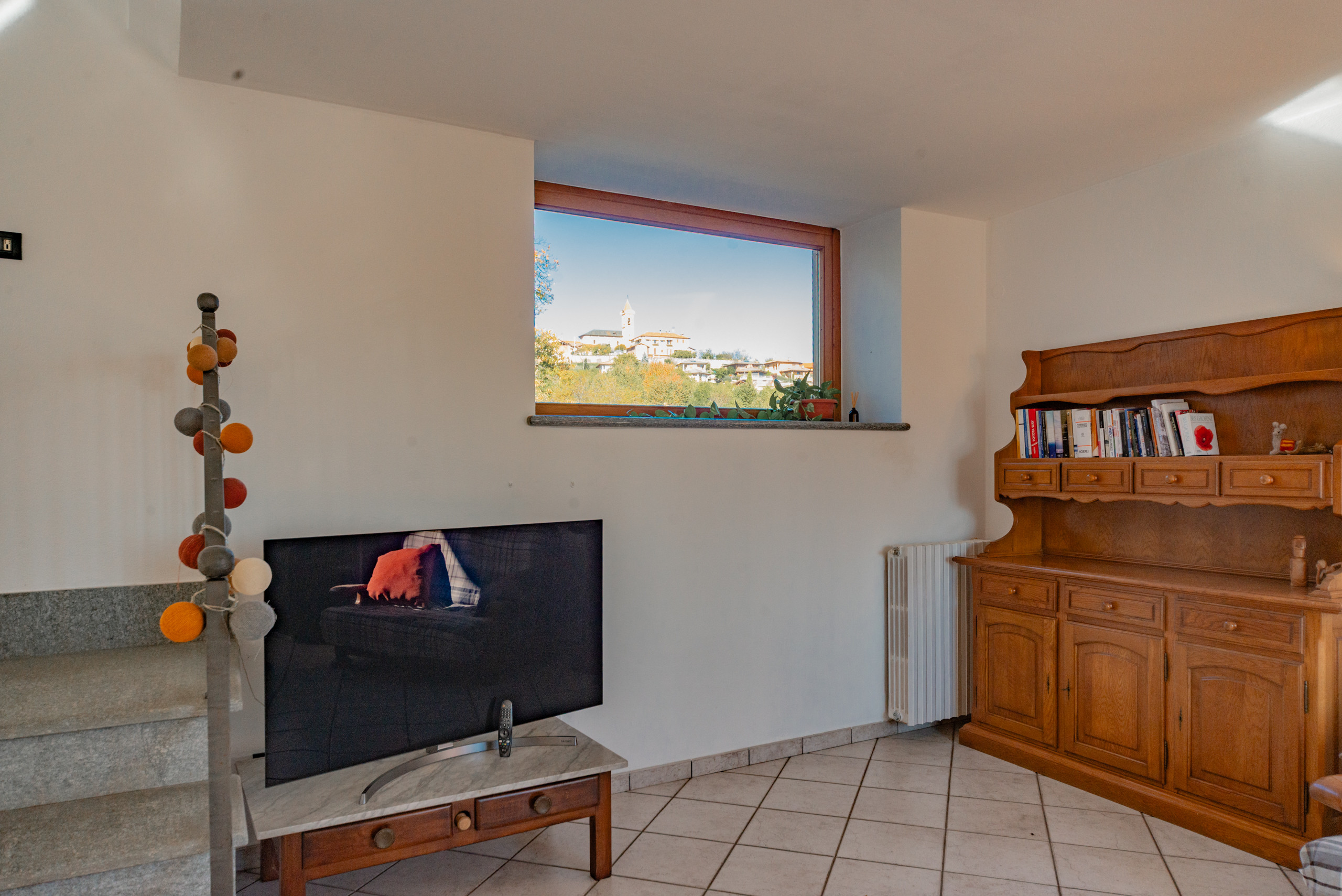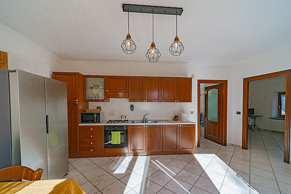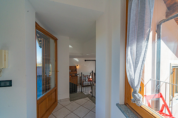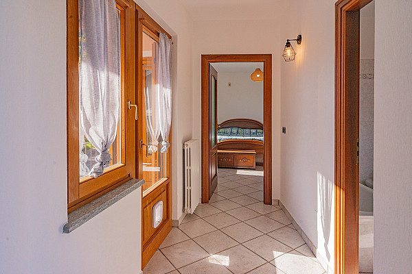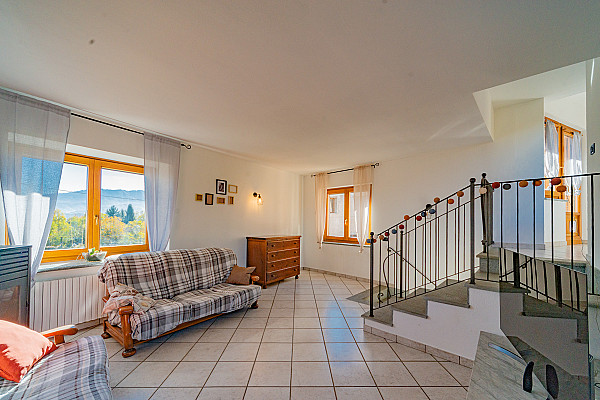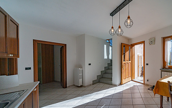 La zona giorno accoglie con il calore di un abbraccio — un soggiorno dove immaginare la prima cena con gli amici, la cucina dove ridere mentre si prepara qualcosa insieme, e la scala che accompagna alle camere, intime e luminose, dove ogni mattina inizia con calma e serenità.