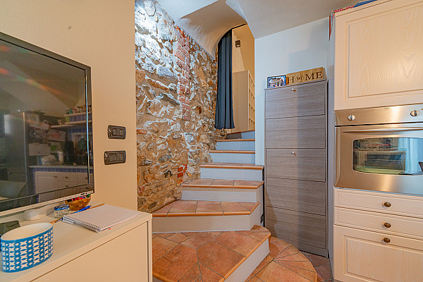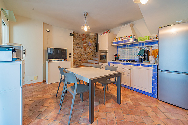 La cucina con angolo TV e il bagno al piano terra sono il cuore quotidiano, caldo e vissuto.