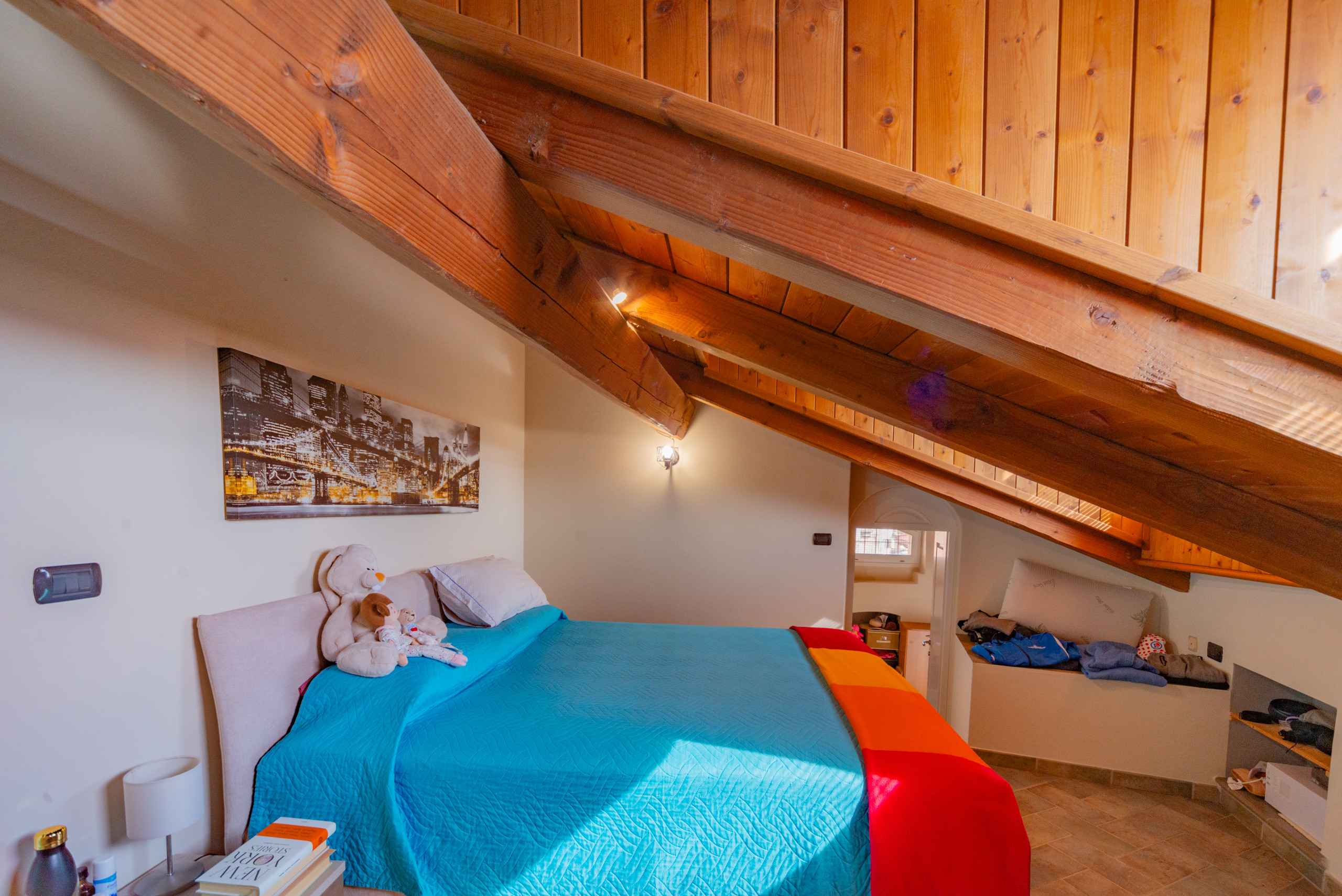 Al piano superiore, gli spazi si aprono e si trasformano: salottini, angoli lettura, un bagno e una camera sottotetto che sembra uscita da una favola di montagna.