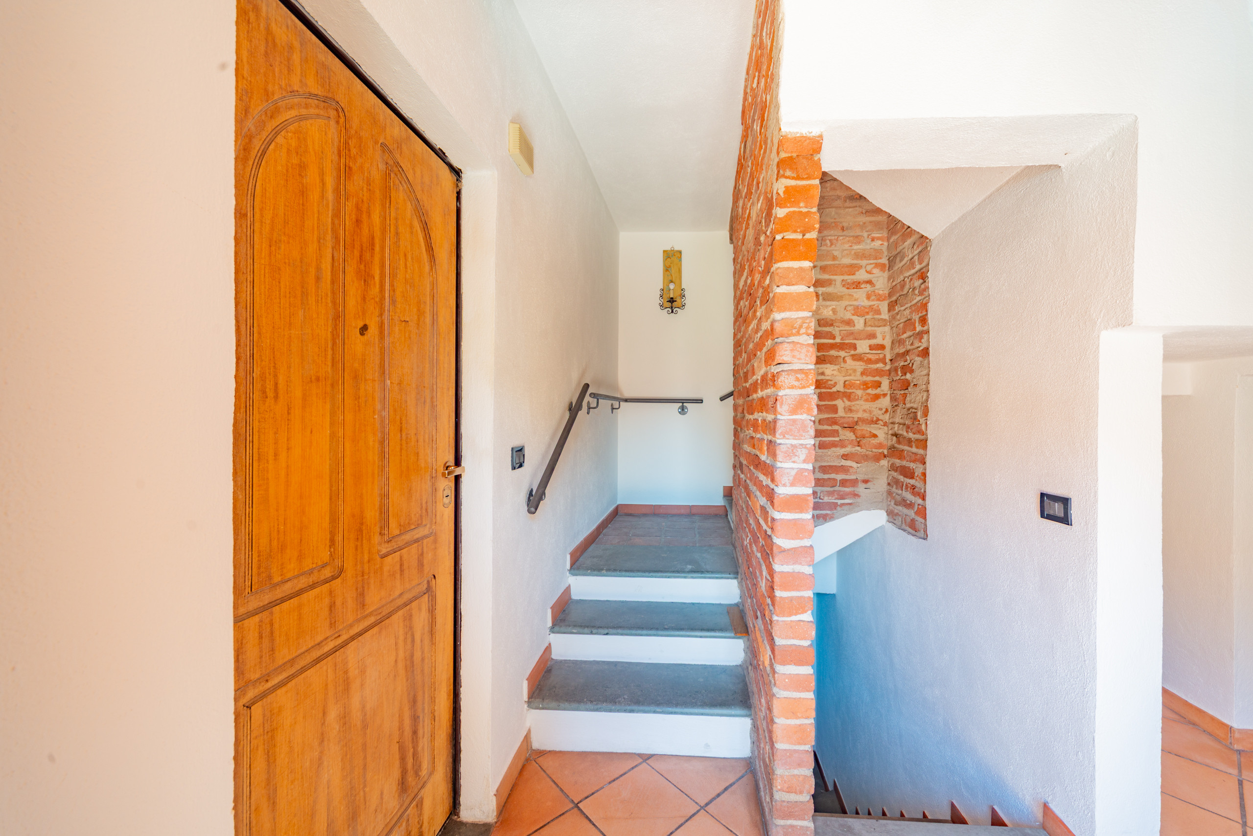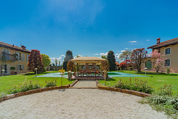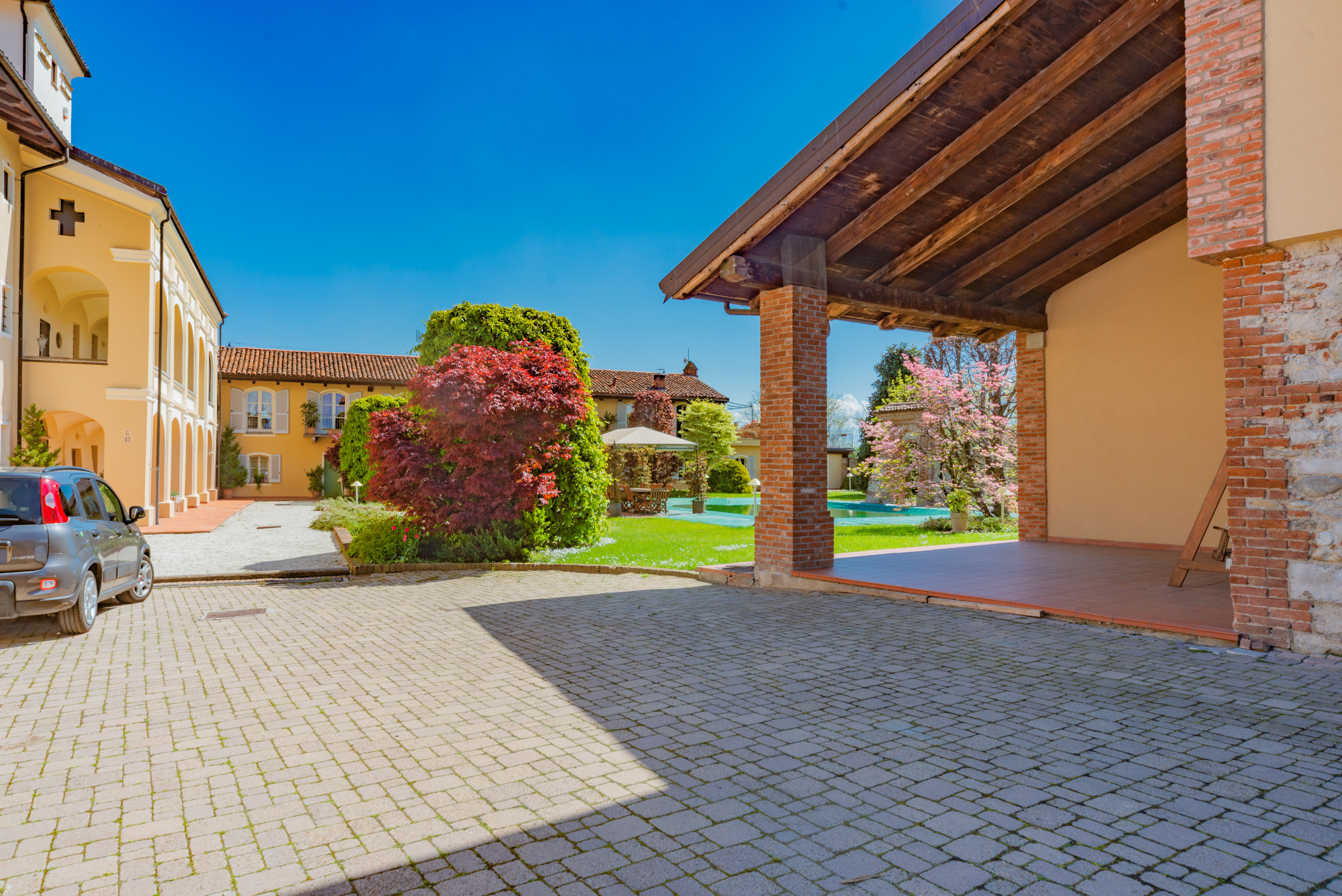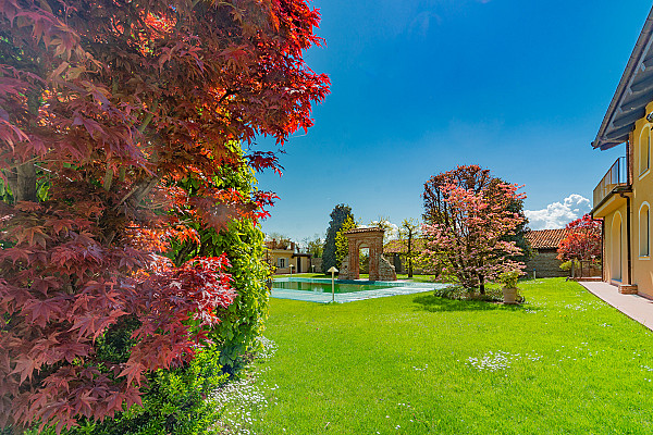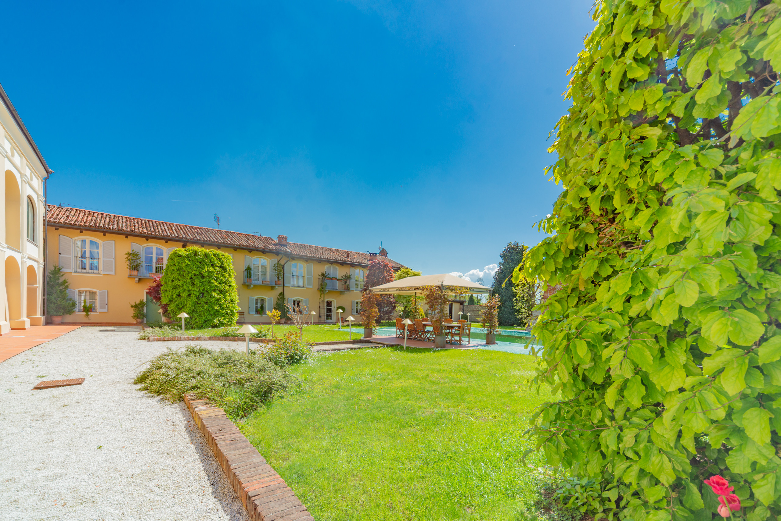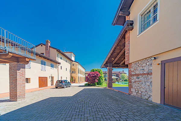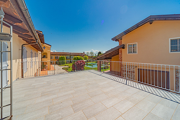 Spazi esterni: piccolo terrazzo privato e accesso diretto al giardino comune con area piscina.