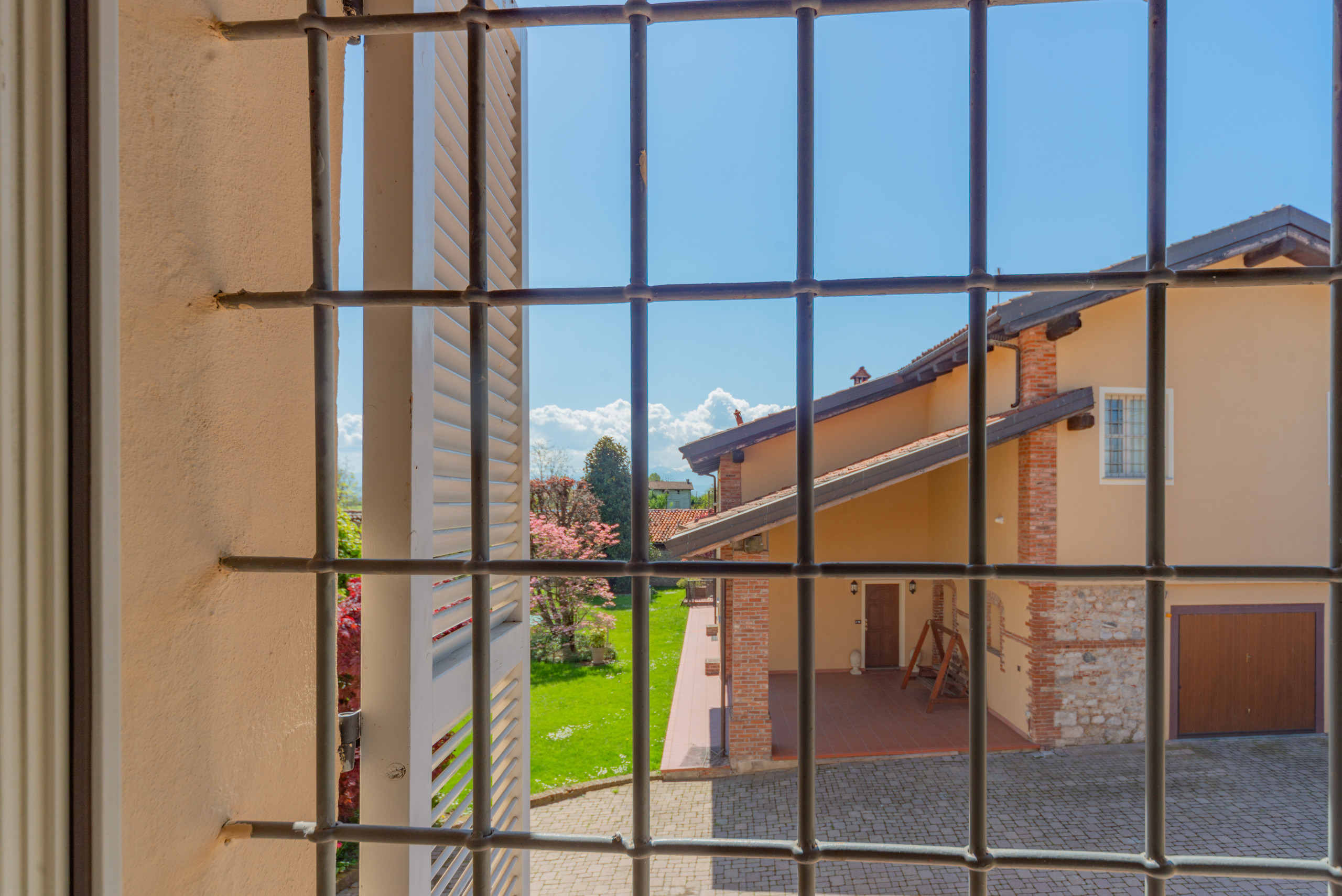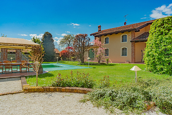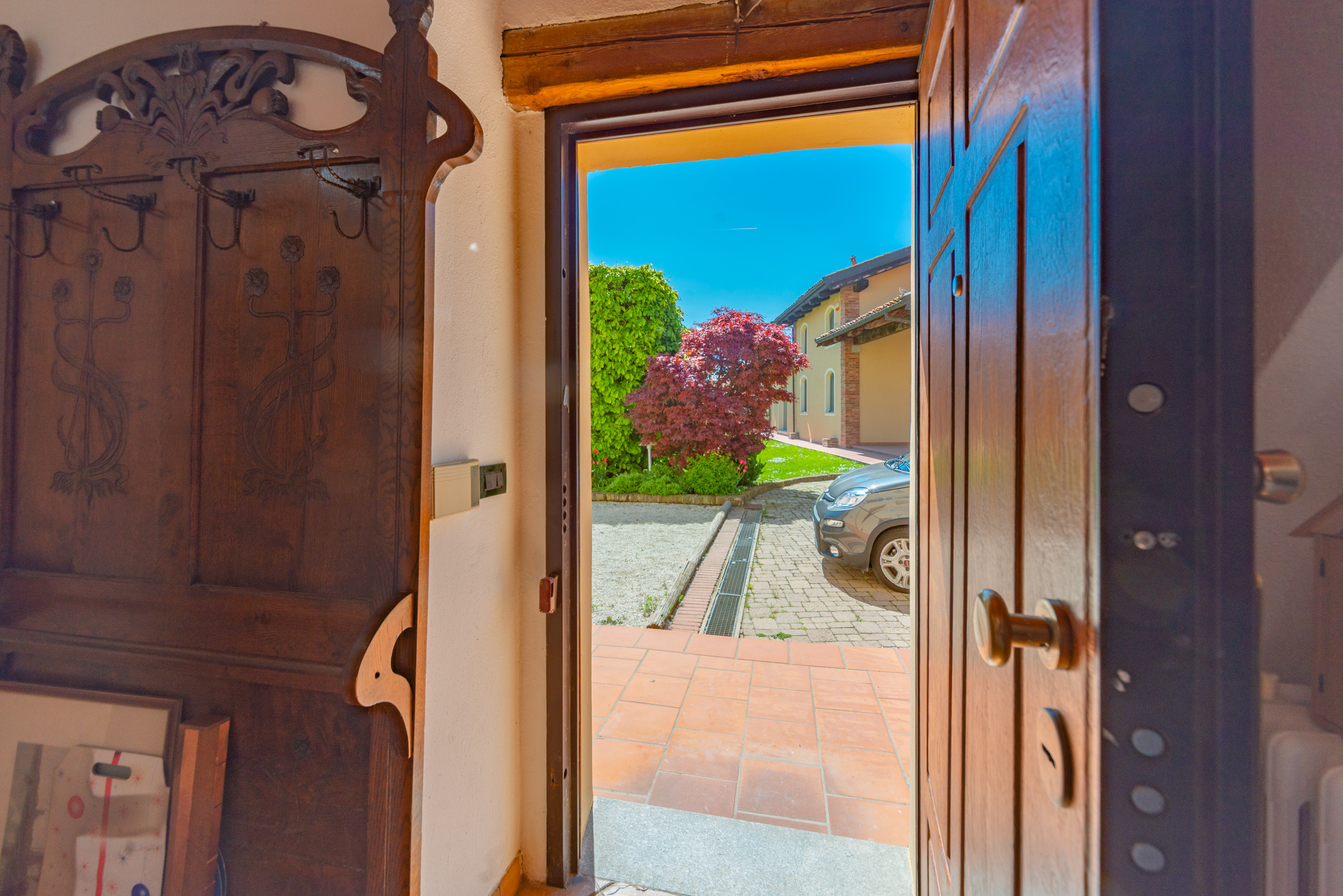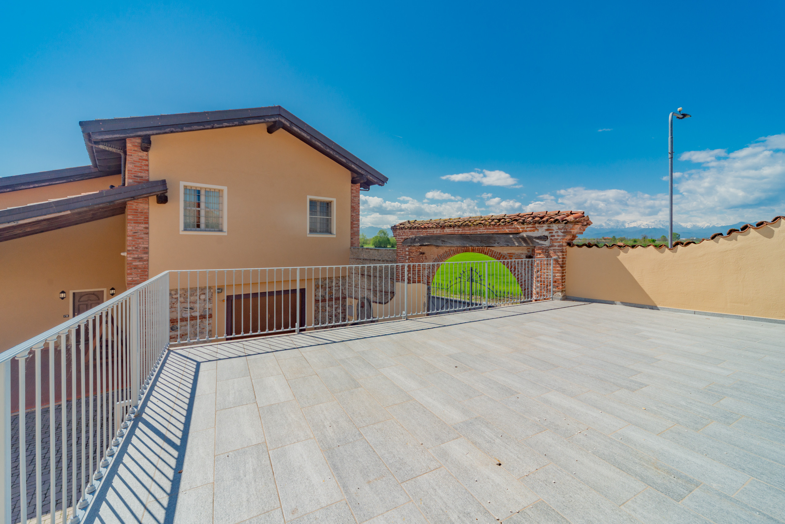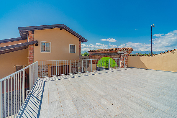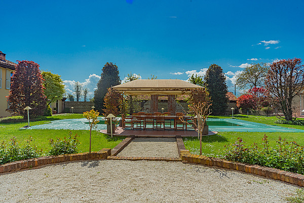 Spazi esterni: piccolo terrazzo privato e accesso diretto al giardino comune con area piscina.